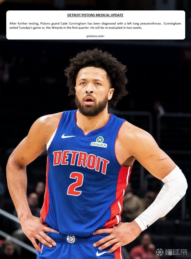 3月19日,活塞官方通报了当家球星坎宁安的伤情,坎宁安左肺塌陷,将于两周后进行复查。
