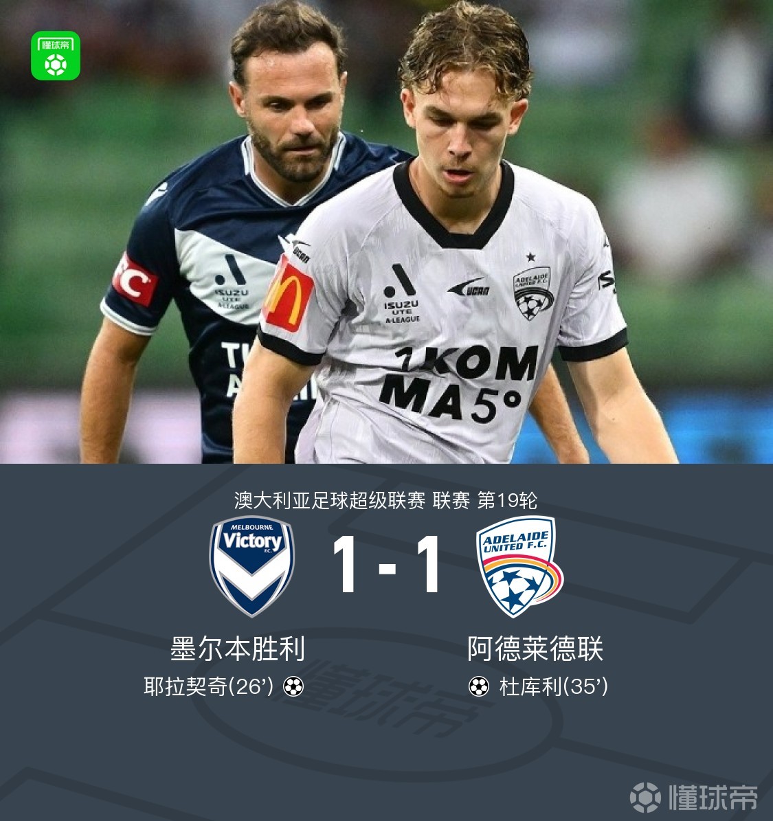 第35分钟,杜库利门前大力补射破门,阿德莱德联1-1墨尔本胜利