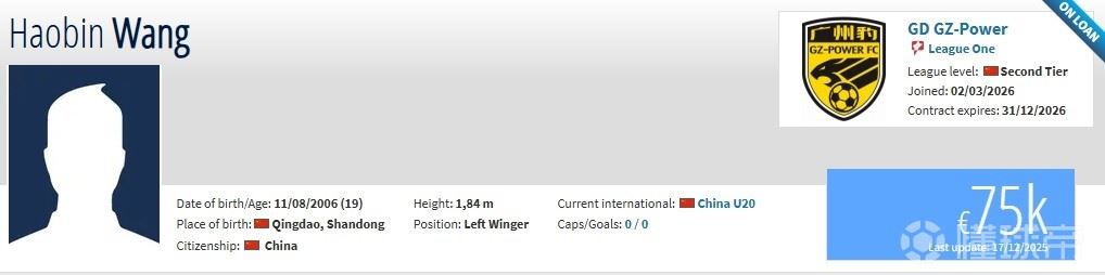 北京时间3月2日,德转更新,山东泰山19岁前锋王昊斌租借加盟广东广州豹。