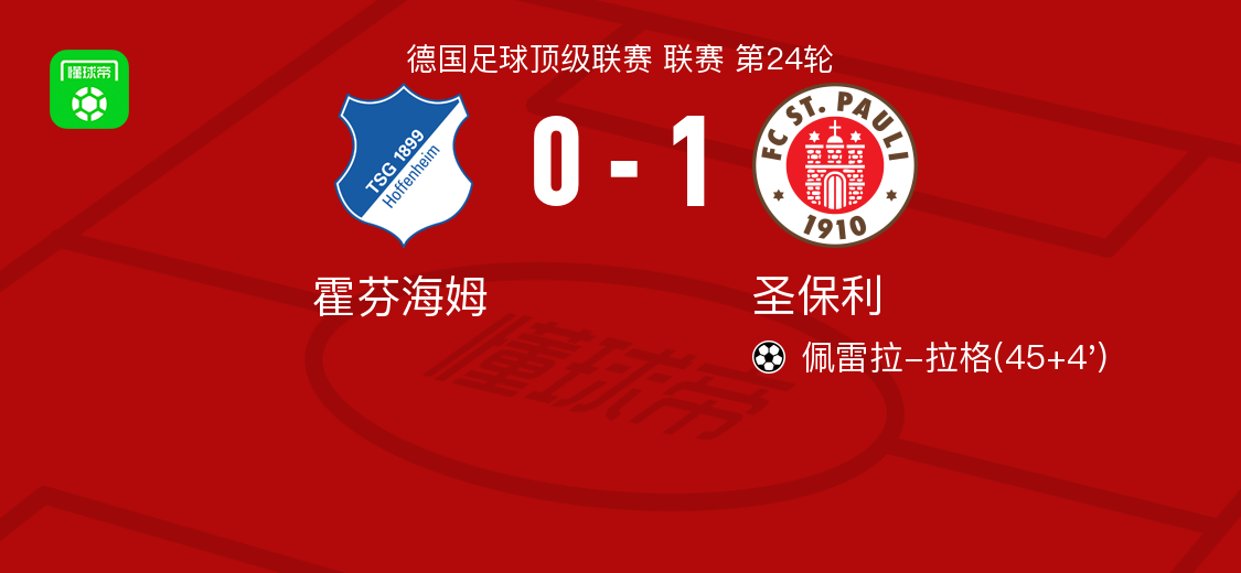 北京时间2月28日德国足球顶级联赛 联赛 第24轮,霍芬海姆主场对阵圣保利。圣保利佩雷拉-拉格破门。最终比分霍芬海姆 0-1 圣保利。