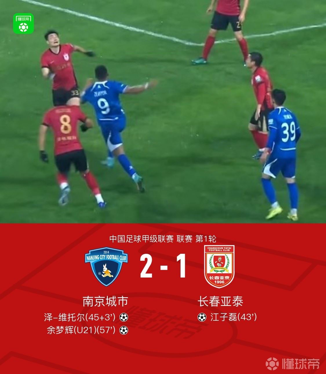 北京时间3月15日中国足球甲级联赛 联赛 第1轮,南京城市主场对阵长春亚泰。上半场,江子磊破门打破场上平衡。补时阶段,泽-维托尔破门将比分扳平。下半场,余梦辉破门将比分反超,随后双方再无建树。最终,南京城市2-1逆转长春亚泰迎来开门红。