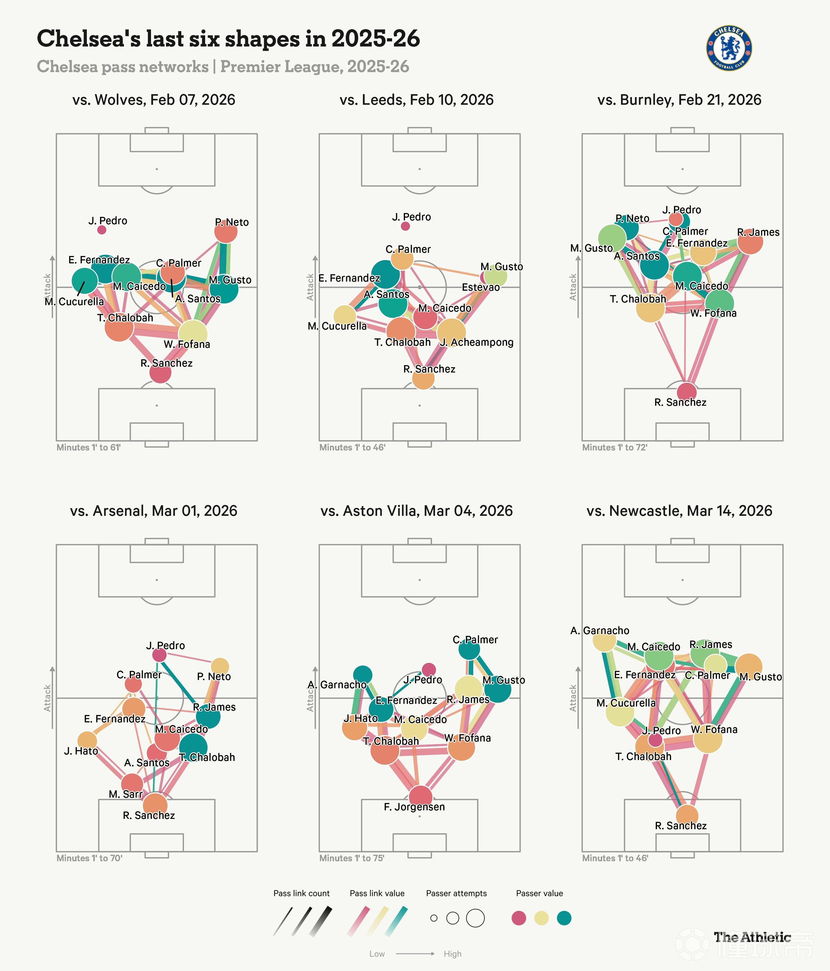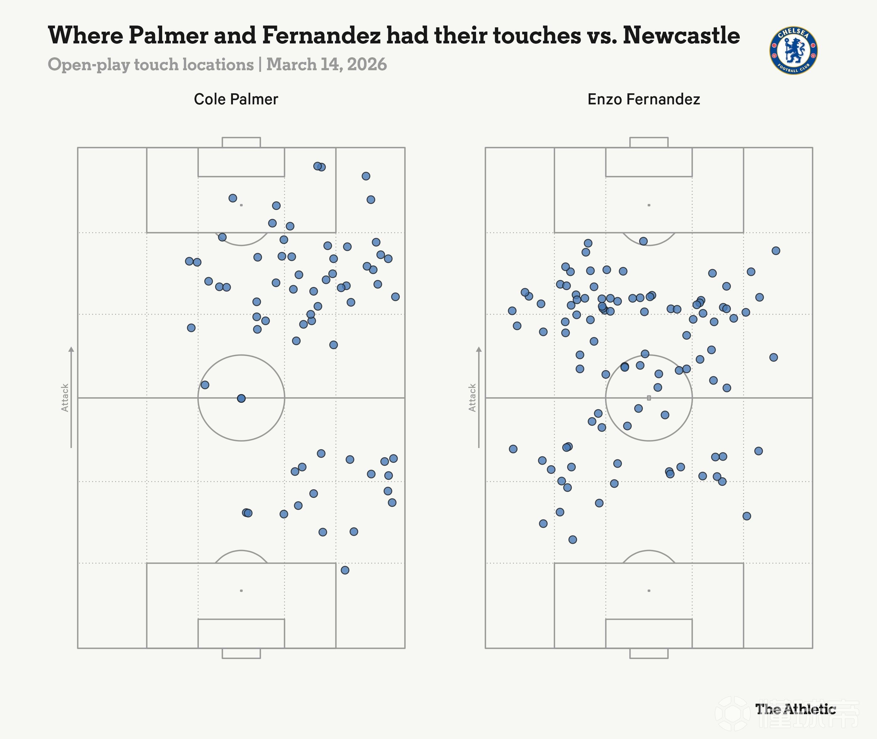 这一转变帮助激发了最好的费尔南德斯,他上赛季各项赛事贡献8球14助攻,2025-26赛季至今已有12球6助攻。这也伴随着帕尔默在进攻三区的产出大幅下降。有理由相信这两个趋势是相关的,即使许多其他因素也导致切尔西十号位陷入困境。