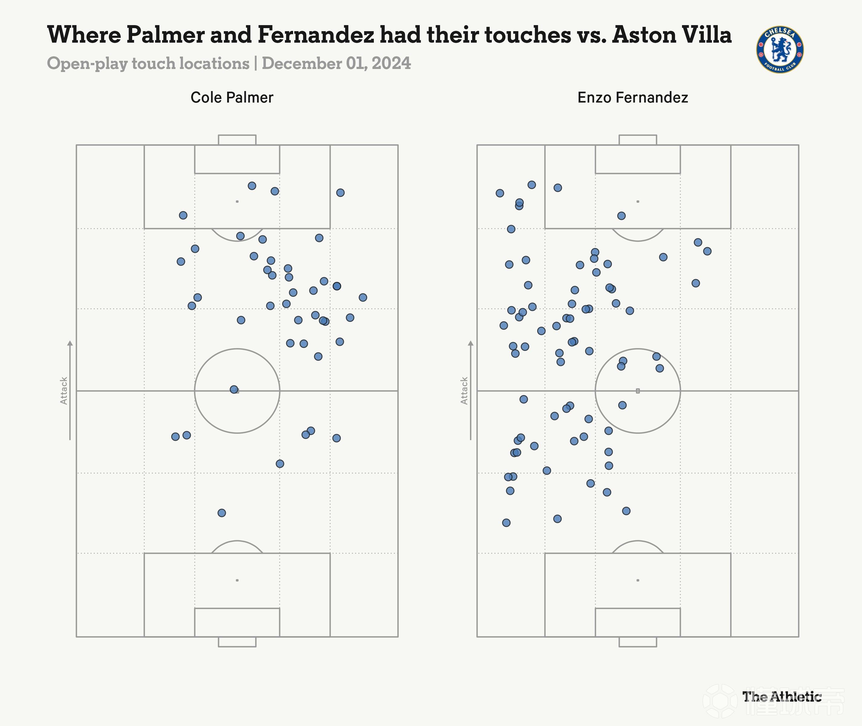 在那场对阵维拉的比赛中,他们各自影响力范围有着自然的平衡,帕尔默主要在球场右侧触球,费尔南德斯在左侧: